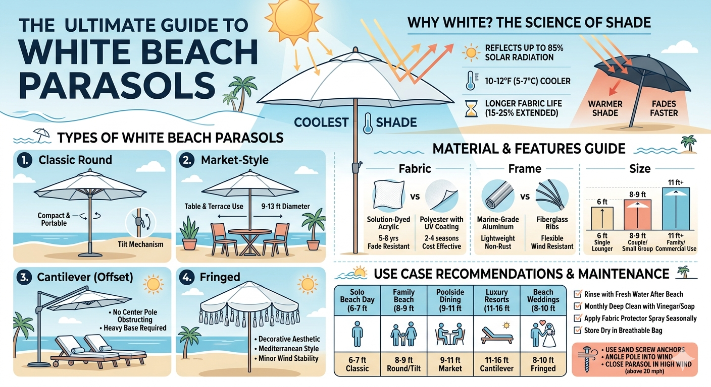 Белый — это не просто выбор стиля — это наиболее термически эффективный цвет для пляжного зонтика, поскольку светлые поверхности отражают, а не поглощают солнечную энергию.